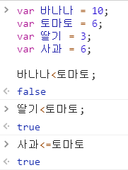 바나나가 10, 토마토가 6으로 바나나가 토마토보다 크기 때문에 False가 되는 것이고,